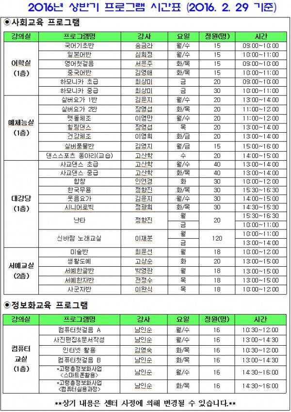 제목 | 2016년 상반기 프로그램 시간표 페이지 정보 작성자 |관리자 작성일 |16-02-29 10:35 조회 |1,977회 이전글 다음글 목록 본문 *시간표는 사정에 의해 추후 변경될 수 있습니다. 이전글 다음글 목록 이전글골드세대 사회공헌활동 지원사업 참여 신청 안내 다음글2016년 3월 경로식당 식단표 입니다.