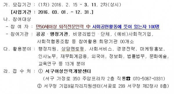 전문성과 경력을 가진 골드세대 퇴직전문인력에게 사회공헌활동의 기회를 제공하기 위한 퇴직 장년의 경험과 비법을 살리는