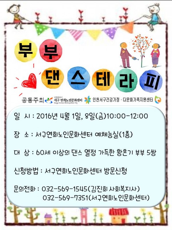 제목 | [특별강좌] 부부댄스테라피 신청안내 페이지 정보 작성자 |관리자 작성일 |16-03-08 09:53 조회 |1,965회 이전글 다음글 목록 본문 . 이전글 다음글 목록 이전글3월 특별 건강강좌 (3/11,18,25 매주 금 총3회) 많은 참석 바랍니다. 다음글골드세대 사회공헌활동 지원사업 참여 신청 안내