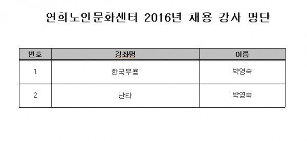 제목 | 2016년 한국무용, 난타 프로그램 강사 합격자 명단 페이지 정보 작성자 |관리자 작성일 |16-04-08 16:28 조회 |1,833회 이전글 다음글 목록 본문 2016년 연희노인문화센터 프로그램 강사 합격자 명단을 붙임과 같이 공고합니다. 이전글 다음글 목록 이전글2016년 5월 6일(금) 임시공휴일 휴관 안내 다음글2016.04.02 배영수 센터장 취임