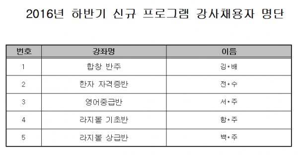 제목 | 2016년 하반기 신규프로그램 강사 합격자 명단 페이지 정보 작성자 |관리자 작성일 |16-07-19 09:42 조회 |1,848회 이전글 다음글 목록 본문 아래와 같이 2016년 하반기 신규프로그램 강사 합격자 명단을 발표합니다. 이전글 다음글 목록 이전글8월 무료 이미용 서비스안내 다음글***2016년 하반기 프로그램 강사(반주자) 모집 공고***