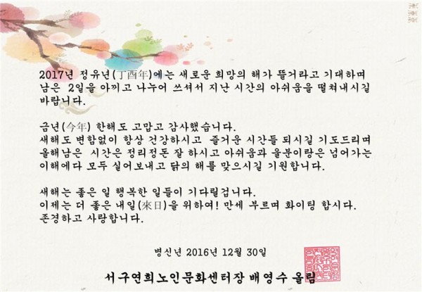 제목 | 안녕하세요. 새해인사드립니다. 페이지 정보 작성자 |관리자 작성일 |16-12-30 11:44 조회 |2,000회 이전글 다음글 목록 본문 . 이전글 다음글 목록 이전글스포츠마사지 자원봉사자 모집 다음글연희노인문화센터 경로식당 급식납품업체 선정결과 공고