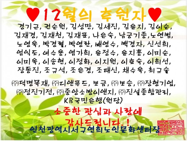 제목 | 12월의 후원자 페이지 정보 작성자 |관리자 작성일 |17-01-09 15:16 조회 |1,874회 이전글 다음글 목록 본문 후원해주신 모든 분들께 감사의 말씀 드립니다. 이전글 다음글 목록 이전글체력단련실·탁구 레슨 안내 다음글스포츠마사지 자원봉사자 모집