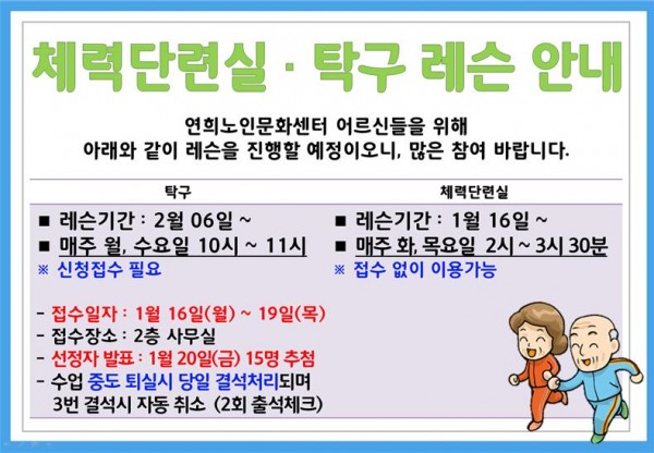 제목 | 체력단련실·탁구 레슨 안내 페이지 정보 작성자 |관리자 작성일 |17-01-11 14:34 조회 |1,761회 이전글 다음글 목록 본문 . 이전글 다음글 목록 이전글***2017년 서구연희노인문화센터 프로그램 강사 모집 공고*** 다음글12월의 후원자