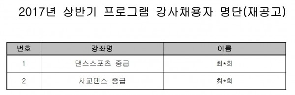 제목 | 2017년 서구연희노인문화센터 프로그램 강사(재공고) 합격자 명단