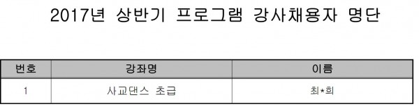 제목 | 2017년 서구연희노인문화센터 프로그램 강사(사교댄스 초급) 합격자 명단