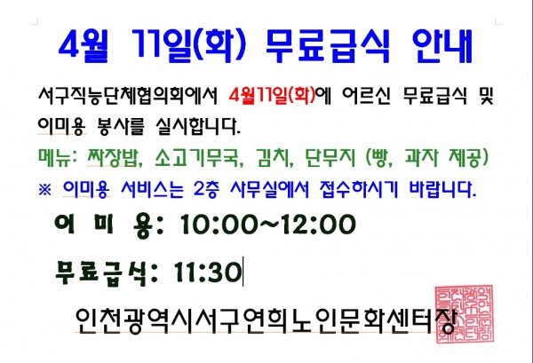 인천광역시 서구연희노인문화센터에서는 4월 11일 직능단체협의회 주최 무료급식 및 이미용 봉사를 실시하오니,