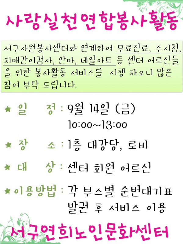 제목 | 어르신을 위한 사랑실천연합봉사활동 페이지 정보 작성자 |관리자 작성일 |12-09-04 09:55 조회 |2,562회 이전글 다음글 목록 본문 . 이전글 다음글 목록 이전글서구연희노인문화센터 한국무용 동아리 강사모집 채용자 명단 다음글서구연희노인문화센터 한국무용 동아리 강사모집 공고
