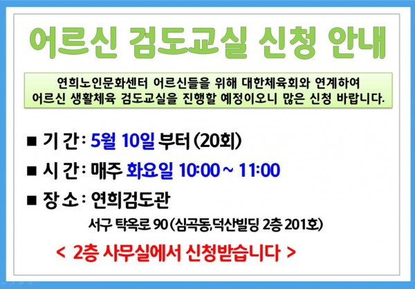 제목 | 어르신 검도교실 신청 안내 페이지 정보 작성자 |관리자 작성일 |17-04-28 15:44 조회 |1,646회 이전글 다음글 목록 본문 . 이전글 다음글 목록 이전글2017년 4월 후원자 다음글2017년도 연희노인문화센터 직원(시설관리) 채용 계획 공고