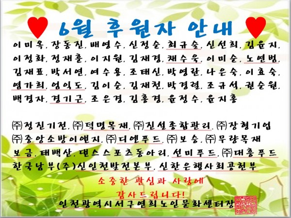 제목 | 2017년 6월 후원자 페이지 정보 작성자 |관리자 작성일 |17-07-06 10:53 조회 |1,960회 이전글 다음글 목록 본문 6월 한달 동안도 연희노인문화센터를 기억해주시고 후원금품으로 동참해주셔서 감사합니다. 6월 후원금품 내역을 첨부와 같이 보고합니다. 이전글 다음글 목록 이전글2017년 제2차 운영위원회 개최 공고 다음글김영란법 요약 및 정리/16년9월28일 부정청탁 및 금품 등 수수의 금지에 관한 법률 시행