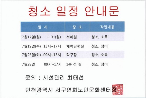 제목 | 연희노인문화센터 청소 일정 안내 페이지 정보 작성자 |관리자 작성일 |17-07-14 09:54 조회 |2,374회 이전글 다음글 목록 본문 . 이전글 다음글 목록 이전글2017년 하반기 프로그램 시간표 안내 다음글2017년 연희노인문화센터 제1차 전직원 연수 계획서 실시