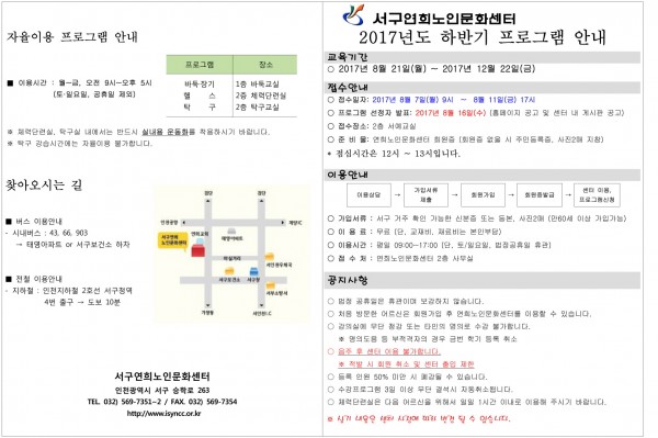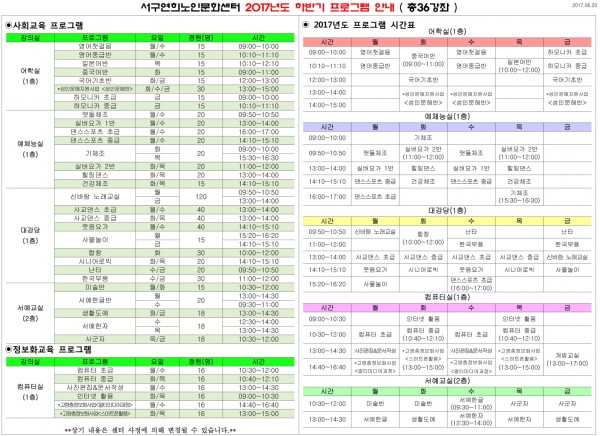 제목 | 2017년 하반기 프로그램 시간표 안내 페이지 정보 작성자 |관리자 작성일 |17-08-09 09:13 조회 |2,404회 이전글 다음글 목록 본문 2017 하반기 프로그램 시간표 입니다. 접수 장소 : 2층 서예교실 시 간 : 9시 ~ 17시 이전글 다음글 목록 이전글2017년 하반기 프로그램 선정자 안내 다음글연희노인문화센터 청소 일정 안내