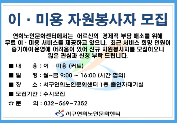 제목 | 이·미용 자원봉사자 모집 안내 페이지 정보 작성자 |관리자 작성일 |17-08-23 17:40 조회 |2,501회 이전글 다음글 목록 본문 - 이전글 다음글 목록 이전글폐렴구균 무료예방접종 안내 다음글***2017년 서구연희노인문화센터 프로그램 강사 모집 (긴급공고)***