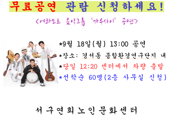 제목 | '가우사이' 무료 공연 관람 신청 안내 페이지 정보 작성자 |관리자 작성일 |17-09-15 10:26 조회 |1,017회 이전글 다음글 목록 본문 많은 신청 부탁 드립니다. 이전글 다음글 목록 이전글추억극장 미림 2017년 9월 상영작 안내 다음글***2017년 서구연희노인문화센터 프로그램 강사 모집 (긴급공고)***