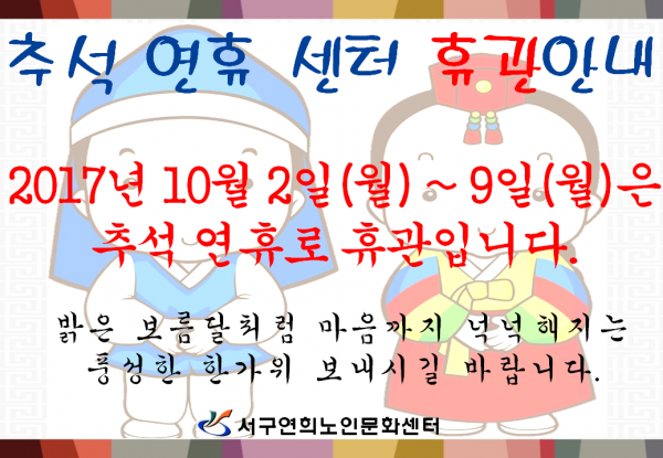 제목 | 2017년 추석 연휴 센터 휴관안내 페이지 정보 작성자 |관리자 작성일 |17-09-26 09:31 조회 |1,679회 이전글 다음글 목록 본문 . 이전글 다음글 목록 이전글회원증 분실 재발급 안내 다음글2017 어르신 운전자 교통안전교육 안내