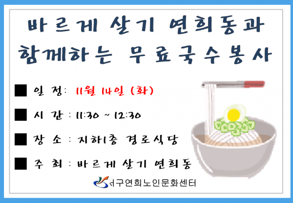 제목 | 바르게 살기 연희동과 함께하는 무료국수봉사 페이지 정보 작성자 |관리자 작성일 |17-11-13 17:53 조회 |969회 이전글 다음글 목록 본문 바르게 살기 연희동에서 센터 이용 어르신을 대상으로 무료국수봉사를 진행해주신다고 합니다. 많은 이용 바랍니다 ^^. 이전글 다음글 목록 이전글2017 작품집 발간 작품 제출 안내 다음글회원증 분실 재발급 안내