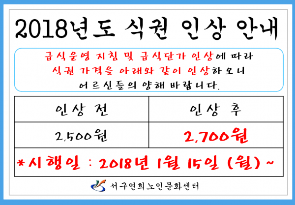 제목 | 2018년도 식권 가격 인상 안내 페이지 정보 작성자 |관리자 작성일 |18-01-11 11:29 조회 |2,699회 이전글 다음글 목록 본문 ※인천광역시 노인시설 경로식당 급식단가 인상에 따라, 인천 전체 노인시설 유료급식비 일괄적으로 인상 이전글 다음글 목록 이전글2018년 서구연희노인문화센터 프로그램 강사 합격자 명단 다음글2018년도 연희노인문화센터 예산서 공고