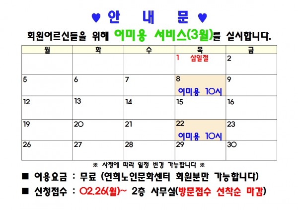 제목 | 2018년 3월 이미용 봉사일정 안내 (마감) 페이지 정보 작성자 |관리자 작성일 |18-02-19 13:50 조회 |898회 이전글 다음글 목록 본문 *상기 일정은 봉사자 분의 사정에 따라 변경 될 수 있습니다* 이전글 다음글 목록 이전글2017년 연희노인문화센터 결산보고 다음글2018년 2월 이미용 봉사일정 안내(마감)