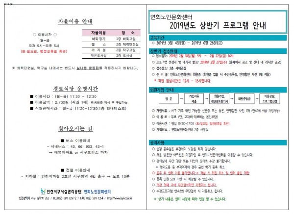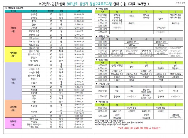 제목 | **2019년 상반기 평생교육프로그램 접수안내** 페이지 정보 작성자 |관리자 작성일 |19-01-22 11:26 조회 |1,795회 이전글 다음글 목록 본문 2019년 상반기 평생교육 프로그램 입니다. 사진을 클릭하면 크게 볼수 있습니다. 이전글 다음글 목록 이전글***2019년 서구연희노인문화센터 프로그램 강사 모집 (재공고)-사교댄스 초/중급*** 다음글<인천시민안전보험 안내>