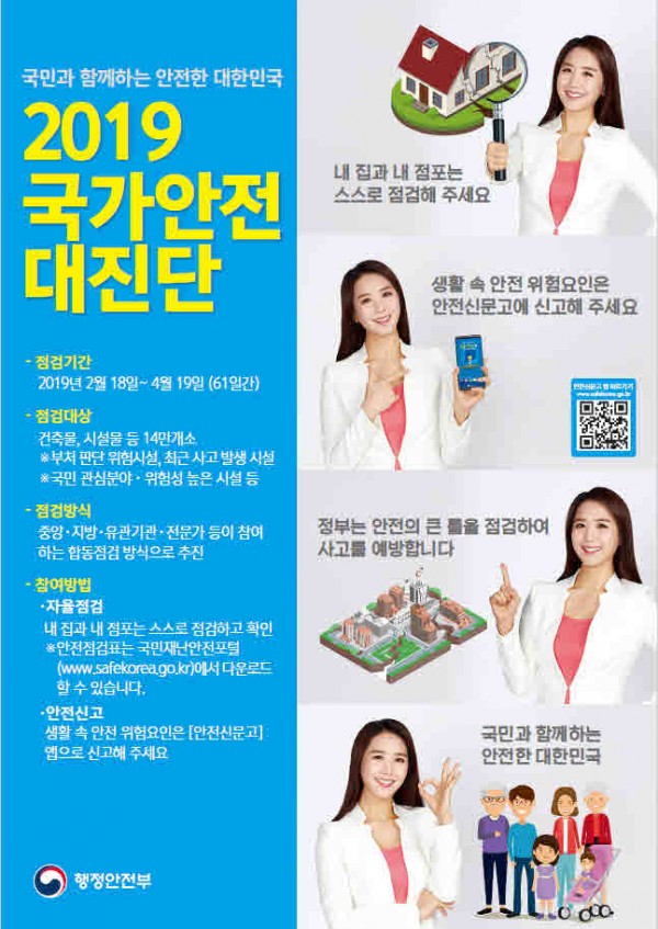 제목 | 2019 국가안전 대진단 안내 페이지 정보 작성자 |관리자 작성일 |19-03-05 10:28 조회 |985회 이전글 다음글 목록 본문 2019 국가안전 대진단 안내 이전글 다음글 목록 이전글(2019)독서지도 프로그램 강사 모집 공고 다음글2019년 상반기 프로그램 선정자 발표