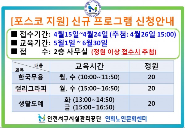 제목 | 2019년 [포스코 지원] 신규 프로그램(한국무용, 캘리그라피, 생활도예) 수강생 접수 안내 페이지 정보 작성자 |관리자 작성일 |19-04-15 11:45 조회 |884회 이전글 다음글 목록 본문 프로그램 정원 이상 접수시 4월26일 추첨합니다 (4월29일(월) 선정자 발표) 이전글 다음글 목록 이전글2018년도 연희노인문화센터 결산공고 다음글제4회 재난안전전시회 「가족 안전체험 축제」안내