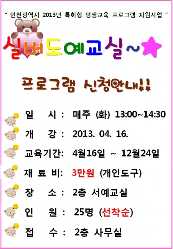 제목 | 실버도예교실 프로그램 신청안내..♬ 페이지 정보 작성자 |관리자 작성일 |13-04-02 12:46 조회 |2,546회 이전글 다음글 목록 본문 . 이전글 다음글 목록 이전글2012년 연희노인문화센터 결산보고 다음글* 상반기 프로그램 선정자 명단 (어학, 서예) *