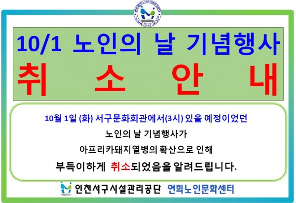 제목 | 2019년 노인의 날 기념행사 취소 안내(주관:인천 서구청 노인복지과)