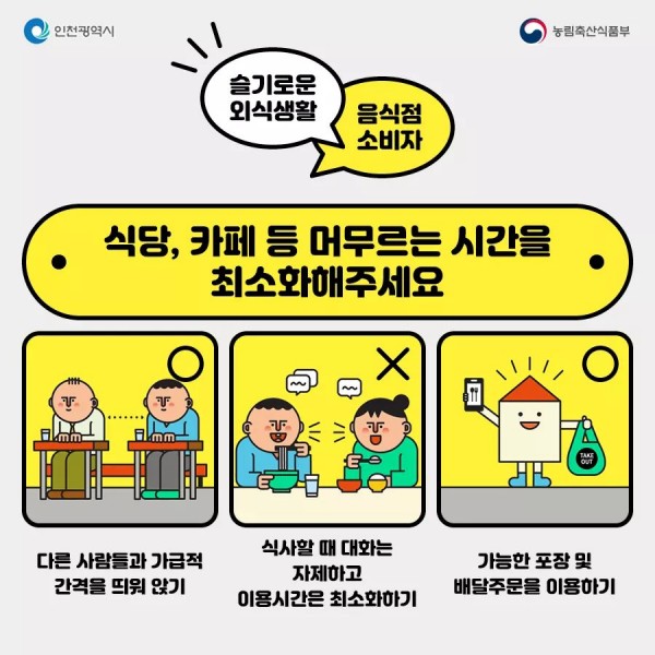 제목 | 코로나19 예방을 위한 슬기로운 외식생활 페이지 정보 작성자 |관리자 작성일 |20-06-01 15:51 조회 |776회 이전글 다음글 목록 본문 코로나19 예방을 위한 슬기로운 외식생활 출처 : 인천광역시 이전글 다음글 목록 이전글마스크 판매! 요일 상관없이 구매! 다음글생활속 거리두기 포스터-가족행사, 결혼식 참석시 주의