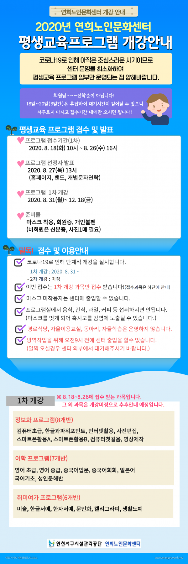 제목 | 2020년 평생교육프로그램 개강안내 및 시간표 페이지 정보 작성자 |관리자 작성일 |20-08-11 16:32 조회 |912회 이전글 다음글 목록 본문 --- 이전글 다음글 목록 이전글[394번 공지글 관련]2020 평생교육 프로그램 수강 신청 잠정 연기 안내 다음글[코로나19포스토]-마스크착용!