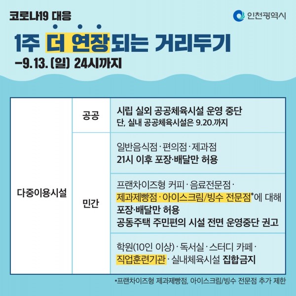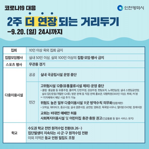 제목 | [코로나19] 사회적 거리두기 기간 연장 페이지 정보 작성자 |관리자 작성일 |20-09-07 10:01 조회 |777회 이전글 다음글 목록 본문 ------------------------------------------- 출처 : 인천광역시청 이전글 다음글 목록 이전글[코로나19] 보고싶어도 다음에 만나요. 다음글[코로나19] 수도권 2단계 방역 강화방안