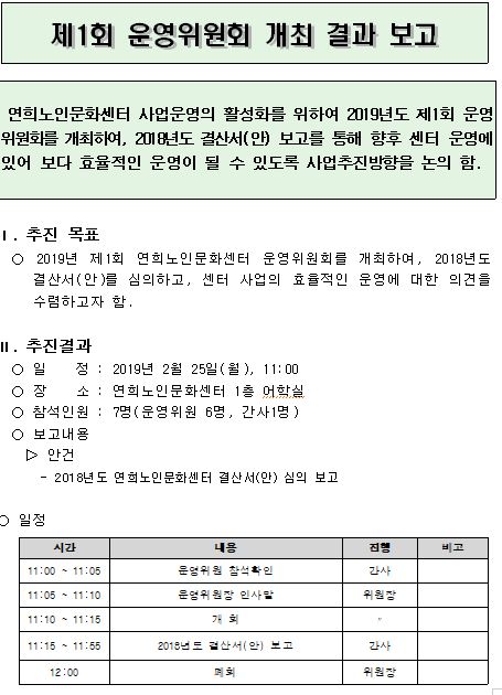 2019년 제1회 운영위원회 사회복지법 제36조 및 시행규칙 제24조에 의거하여 아래와 같이 개최하였습니다.