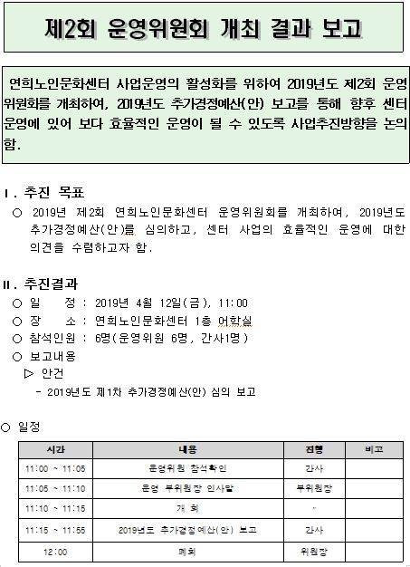 2019년 제2회 운영위원회 사회복지법 제36조 및 시행규칙 제24조에 의거하여 아래와 같이 개최하였습니다.