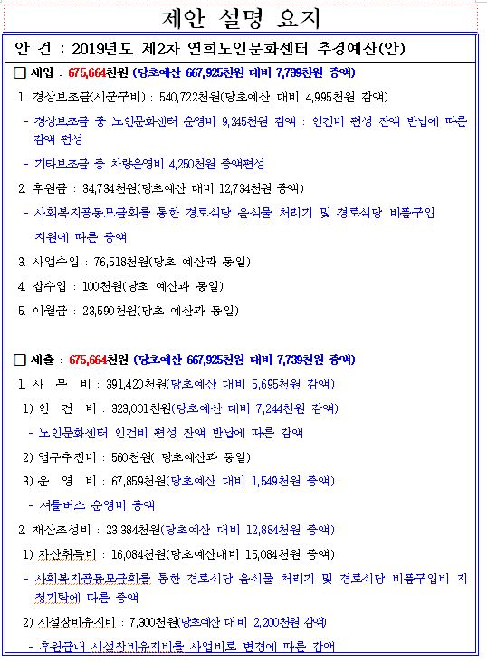 1) 2019년도 연희노인문화센터 제2차 추가경정예산(안) 심의 보고
