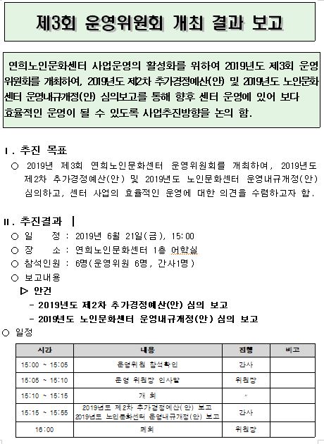2019년 제3회 운영위원회 사회복지법 제36조 및 시행규칙 제24조에 의거하여 아래와 같이 개최하였습니다.