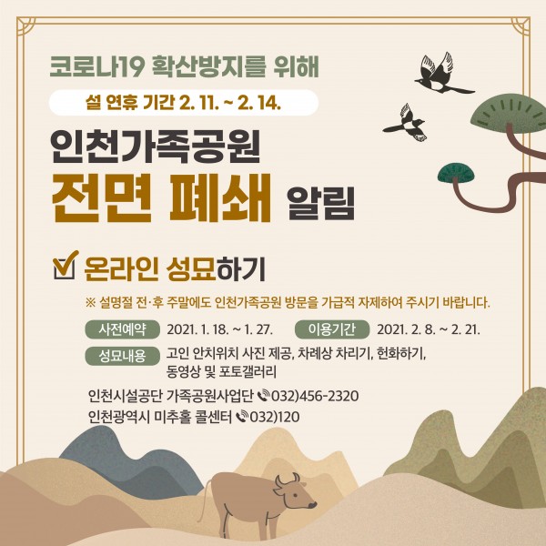 제목 | 코로나19 확산방지를 위한 인천가족공원 전면폐쇄 페이지 정보 작성자 |관리자 작성일 |21-01-18 17:49 조회 |930회 관련링크 http://grave.insiseol.or.kr 1330회 연결 이전글 다음글 목록 본문 이전글 다음글 목록 이전글에너지 바우처 사용 안내 다음글2018년 노인자원봉사자 모집 공고