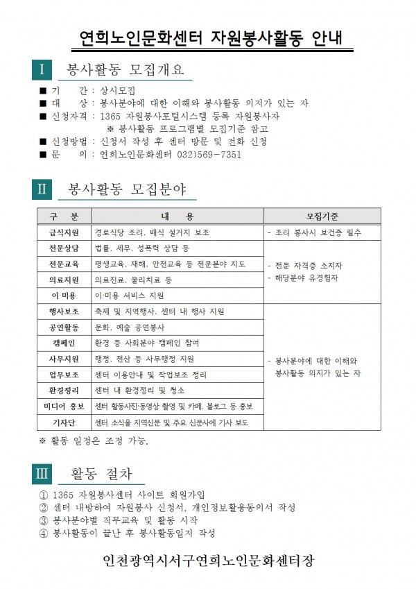 제목 | 2018년 연희노인문화센터 자원봉사자 모집 안내 페이지 정보 작성자 |관리자 작성일 |18-01-13 09:30 조회 |680회 이전글 다음글 목록 본문 . 이전글 다음글 목록 이전글2019년 노인자원봉사단 모집 다음글에너지 바우처 사용 안내