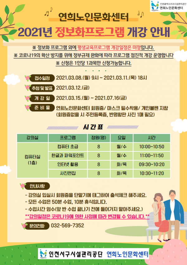 제목 | 2021년 정보화 프로그램 개강안내 페이지 정보 작성자 |관리자 작성일 |21-03-02 11:18 조회 |991회 이전글 다음글 목록 본문 정보화 프로그램 외에 평생교육프로그램은 아직 개강 미정입니다.코로나19 상황에 따라 점진적 개강 예정이오니 양해바랍니다. 이전글 다음글 목록 이전글2019년도 연희노인문화센터 후원금 수입 및 사용 결과보고 다음글새해 복 많이 받으세요!