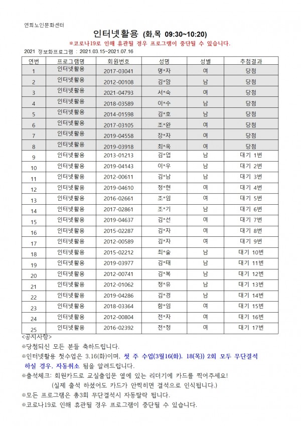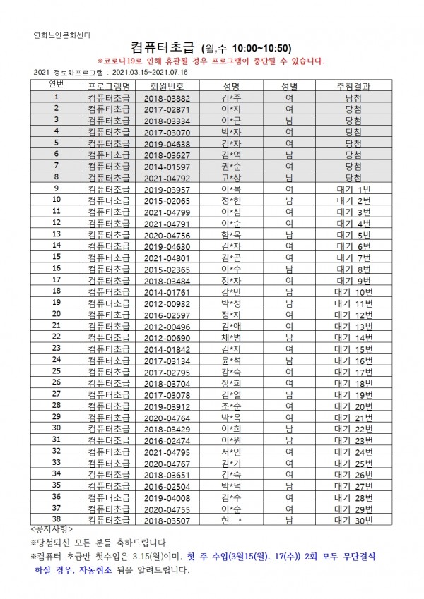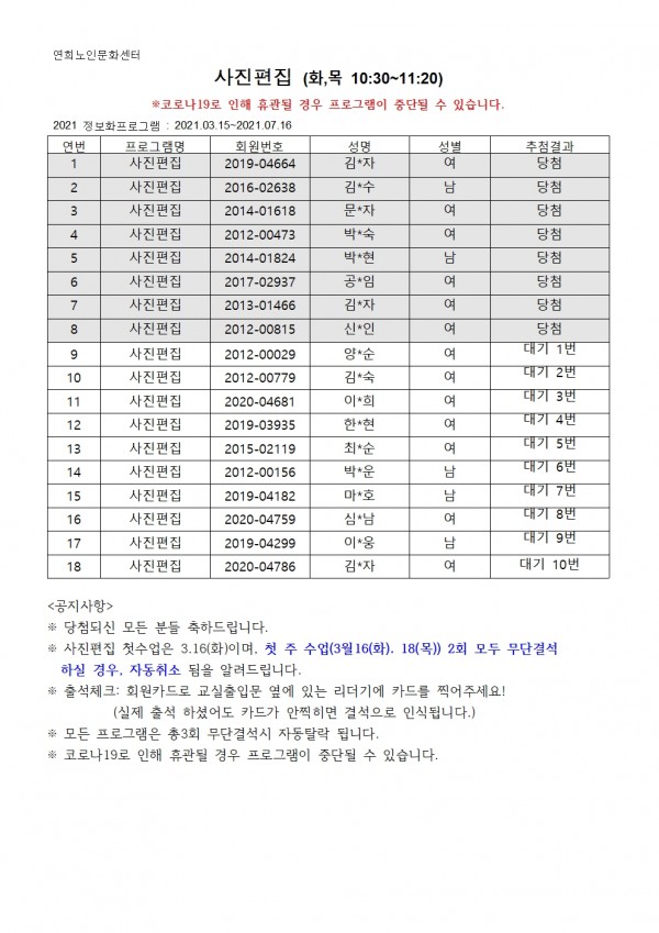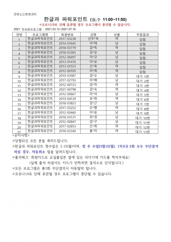 제목 | 2021년 정보화프로그램 당첨 및 대기자 선정발표 페이지 정보 작성자 |관리자 작성일 |21-03-12 13:59 조회 |1,568회 이전글 다음글 목록 본문 2021년 정보화프로그램 당첨 및 대기자 선정발표 이전글 다음글 목록 이전글2021년 평생교육(정보화)프로그램 추첨영상 다음글2020년도 연희노인문화센터 결산공고