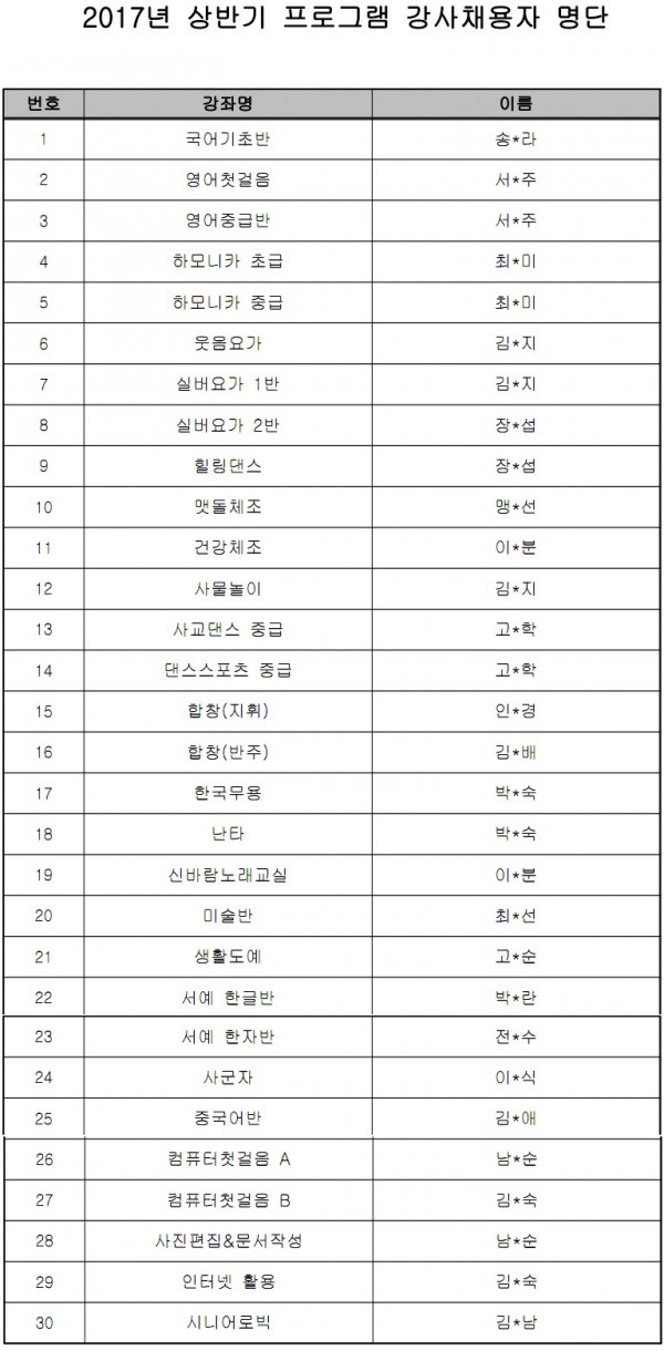 2017년 서구연희노인문화센터 프로그램 강사 합격자 명단 페이지 정보 작성자 관리자 댓글 0건 조회 2,602회 작성일 17-02-03 10:44 본문 . 목록 이전글2017년 1월 후원자 다음글2017년도 연희노인문화센터 직원(영양사)채용 계획 공고 댓글목록 댓글목록 등록된 댓글이 없습니다.
