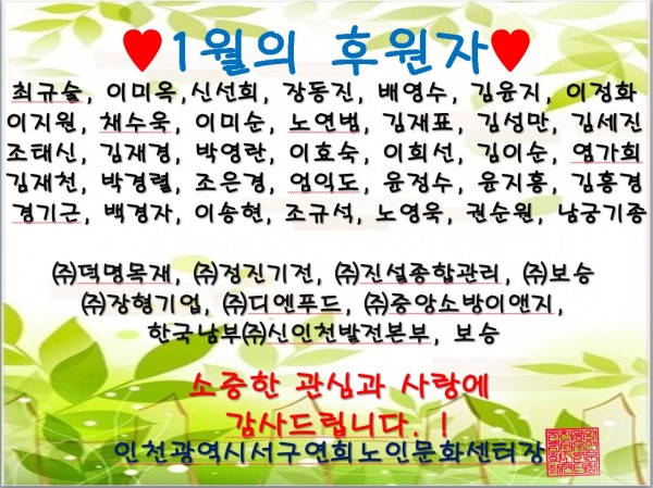 2017년 1월 후원자 페이지 정보 작성자 관리자 댓글 0건 조회 3,134회 작성일 17-02-06 13:58 본문 후원해 주신 모든 분들께 감사의 말씀드립니다. 목록 이전글개인정보 보호를 위해 게시물 작성시 필독 부탁드립니다. 다음글2017년 서구연희노인문화센터 프로그램 강사 합격자 명단 댓글목록 댓글목록 등록된 댓글이 없습니다.