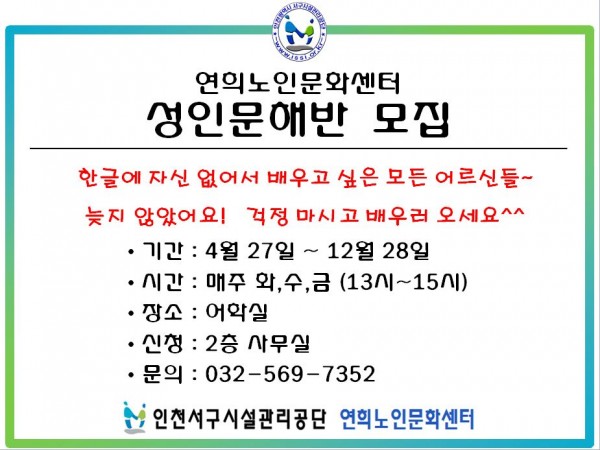 2018년 성인문해지원사업 선정! [ 성인문해반 ] 모집 페이지 정보 작성자 관리자 댓글 0건 조회 833회 작성일 18-06-01 11:42 본문 많은 관심과 신청 바랍니다. 목록 이전글2018년 6월 이미용 봉사일정 안내 다음글2018-04호 연희노인문화센터 시설관리직 채용 최종 합격자 명단 공고 댓글목록 댓글목록 등록된 댓글이 없습니다.