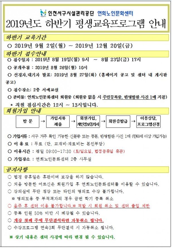2019년 하반기 평생교육 프로그램 수강생 모집 및 접수안내
