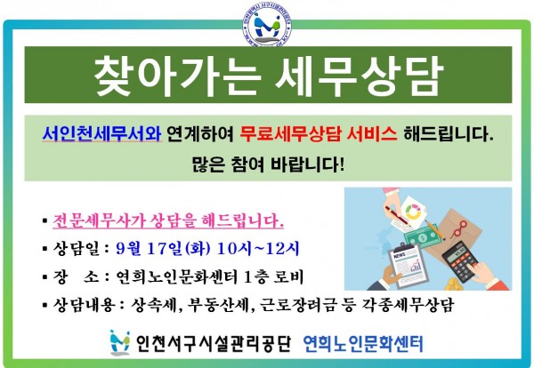 2019년 9월 찾아가는 세무상담소 안내 페이지 정보 작성자 관리자 댓글 0건 조회 835회 작성일 19-09-06 11:22 본문 2019년 9월 찾아가는 세무상담소를 진행합니다. 관심있는 분들의 많은 상담을 바랍니다. 목록 이전글셔틀버스 노선 변경 안내 다음글노인인지활동프로그램 책놀이 수강생모집 댓글목록 댓글목록 등록된 댓글이 없습니다.