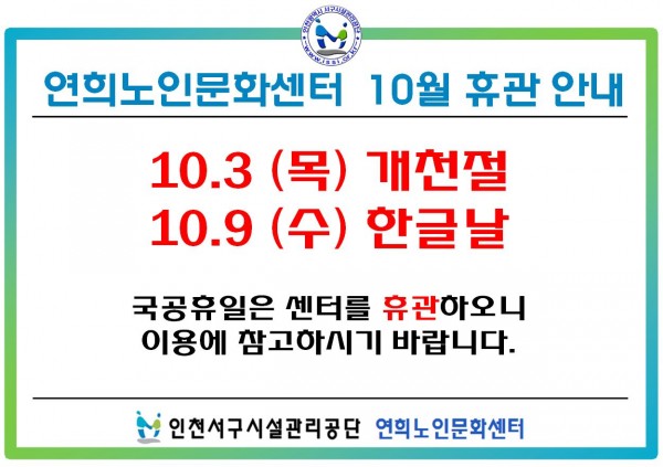 연희노인문화센터 2019년 10월 휴관 안내 페이지 정보 작성자 관리자 댓글 0건 조회 988회 작성일 19-10-02 16:51 본문 연희노인문화센터 2019년 10월 휴관 안내 목록 이전글웰다잉교육 당.죽.맞.죽 교육 안내 다음글2019년 노인의 날 기념행사 취소 안내(주관:인천 서구청 노인복지과) 댓글목록 댓글목록 등록된 댓글이 없습니다.