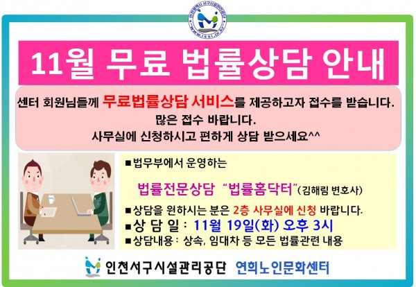 11월 무료법률상담 안내 페이지 정보 작성자 관리자 댓글 0건 조회 893회 작성일 19-11-07 14:08 본문 2019.11.19(화) 오후 3시 법률상담 필요하신 분은 사무실에 신청 바랍니다. 목록 이전글***동아리 회원 모집 안내*** 다음글2019년 하반기 정보화교육 프로그램 2차 접수 선정자 발표 댓글목록 댓글목록 등록된 댓글이 없습니다.