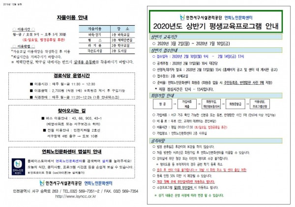 **2020년 상반기 평생교육프로그램 접수안내** 페이지 정보 작성자 관리자 댓글 0건 조회 1,492회 작성일 19-12-26 13:49 본문 그림을 클릭하시면 크게 볼 수 있습니다. 목록 이전글2020년 평생교육프로그램 강사 공고 다음글2019년 노인맞춤돌봄서비스 생활지원사 직원 서류전형 합격자 명단 공고 댓글목록 댓글목록 등록된 댓글이 없습니다.