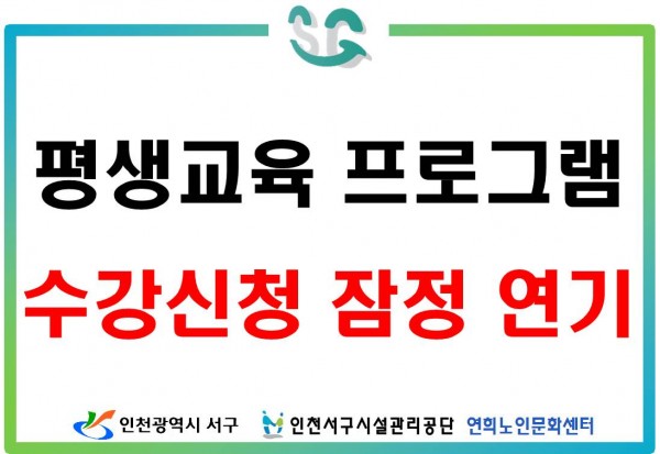 [394번 공지글 관련]2020 평생교육 프로그램 수강 신청 잠정 연기 안내 페이지 정보 작성자 관리자 댓글 0건 조회 895회 작성일 20-08-18 10:09 본문 코로나19 사회적거리두기 2단계 시행으로 프로그램 접수 및 개강을 잠정연기하오니 참고하시기 바랍니다 목록 이전글코로나19 확산에 따른 센터 휴관 연장 안내 다음글2020년 평생교육프로그램 개강안내 및 시간표 댓글목록 댓글목록 등록된 댓글이 없습니다.