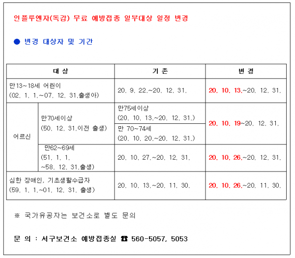 인플루엔자(독감) 무료 예방접종 일부대상 일정 변경 안내 페이지 정보 작성자 관리자 댓글 0건 조회 822회 작성일 20-10-14 13:11 본문 . 목록 이전글자기혈관알기 캠페인(서구보건소) 다음글[코로나19] 사회적거리두기 1단계로 조정(2020.10.12~) 댓글목록 댓글목록 등록된 댓글이 없습니다.