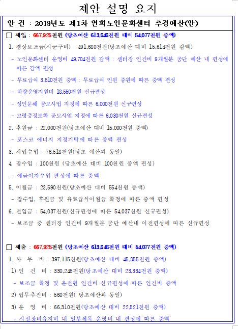 1) 2019년도 연희노인문화센터 제1차 추가경정예산(안) 심의 보고