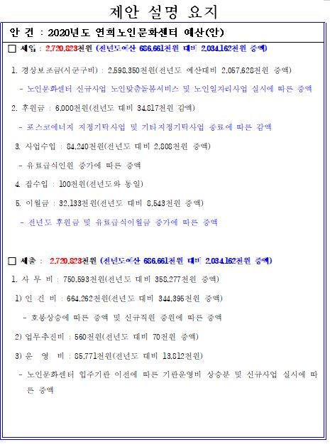 2) 2020년도 연희노인문화센터 예산(안) 심의 보고